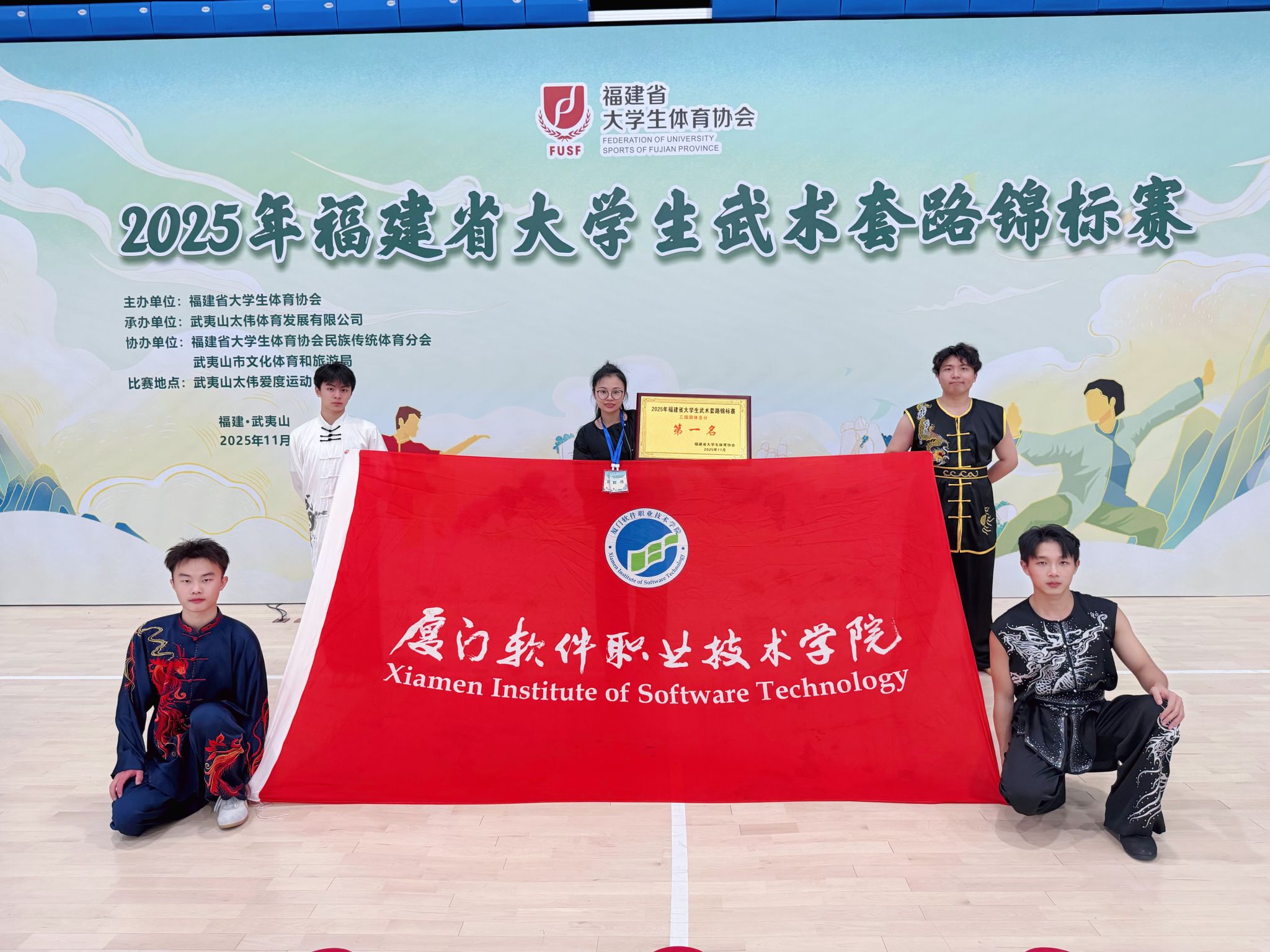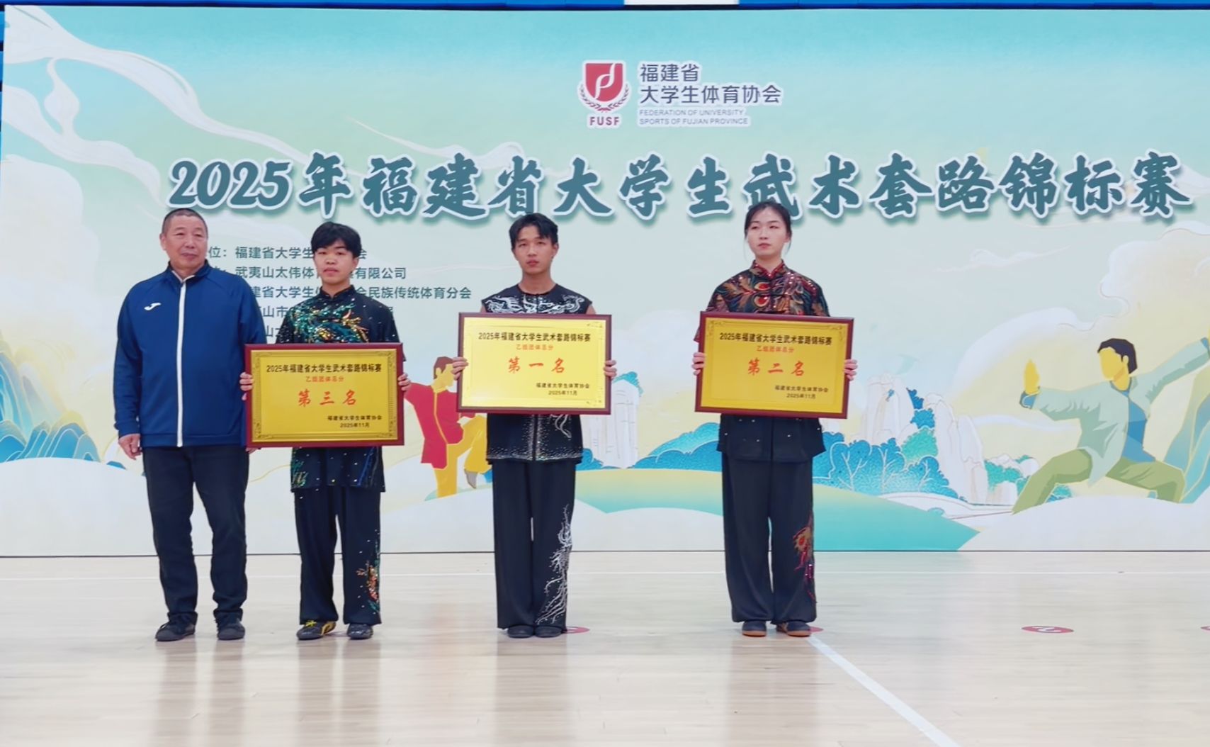 2025年11月21日至23日,福建省大学生武术套路锦标赛在武夷山圆满落幕。我校武术代表队在指导老师李式华的带领下,斩获8项个人荣誉(含6项冠军),并成功摘得乙组(高职高专组)团体总分第一名的优异成绩,充分展现了我校学子的竞技实力与青春风采。