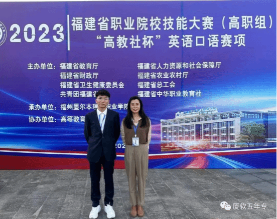 2023年3月12日,厦门软件职业技术学院五年专部教师陈瀛汐指导2020级学生徐景辉在2023年福建省职业院校技能大赛(高职组)英语口语赛项(非专业组)斩获一等奖的佳绩。