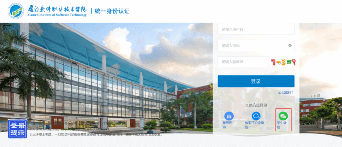 在统一身份认证界面中输入账号密码,学生登录账号为学号,原始密码为“本人身份证后六位加@Xmist”,例如123456@Xmist,学生关注微信公众号“厦门软件学院微服务”后可通过手机微信扫码登录。