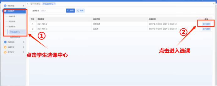 2.在规定的选课时间范围内,点击【进入选课】,进入选课课程页面,如下图所示。
